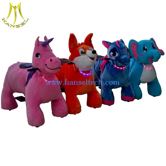 Hansel plush animal scooter are battery operated with coin or non coin type animals,it can walking in outdoor and indoor playground,we use fireproof plush with cotton inside for the animal skin,and structure material inside is mental steel frame which is very strong to bear a weight of 130kg.with its attractive appearance to consumers and fast profits to operator,more and more people are join this business,Will you join this business?